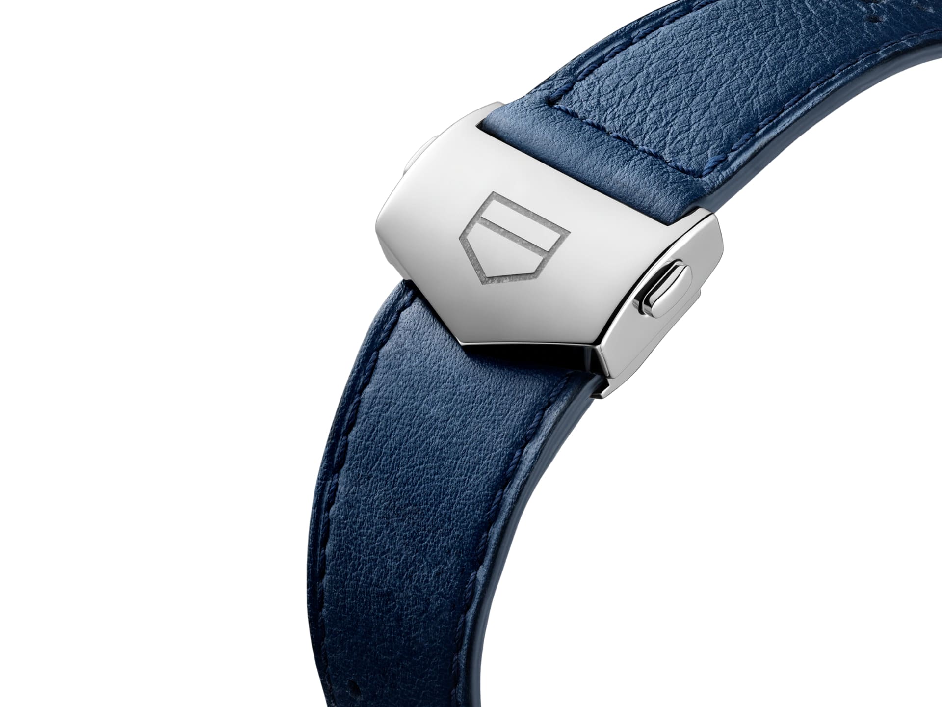 Мужские наручные часы-хронографХронографФункция позволяет измерять отрезки времени с особой точностью: часы, минуты, секунды. Верным признаком хронографа является наличие на циферблате 3 дополнительных окошек-счётчиков. TAG Heuer Monaco CBL2115.FC6494. Эта легендарная специальная серия TAG Heuer Monaco ярко украшена харизматичной ливреей бренда Gulf. В соответствии со своей необычной историей, его синий циферблат с изображением кисти в виде солнечных лучей украшен культовыми тонкими полосками и логотипом Gulf на отметке «6 часов», а также винтажным логотипом Heuer на отметке «12 часов». Часы для истинных ценителей, оснащенные мануфактурным калибром Heuer 02. Стрелки с люминесцентным покрытиемЛюминесцентное покрытиеПозволяет считывать показания времени в темноте. Производители наносят на стрелки, часовые индексы, безель или поверхность циферблата светонакопительный состав, дающий холодное свечение. и накладные часовые метки позволяют точно определять время. Как и в оригинале, циферблат защищает выпуклое сапфировое стеклоСапфировое стеклоПрочный и надёжный материал из кристалла сапфира синтетического происхождения, характеризующийся особой твёрдостью и устойчивостью к царапинам и повреждениям. со скошенной кромкой. Стальной корпус диаметром 39 мм с прозрачной задней крышкой гарантирует водонепроницаемость на глубине 100 метров. Синий перфорированный ремешок из телячьей кожи гармонирует с мифическим синим циферблатом. Стальная раскладная застёжкаРаскладная застёжкаТакой тип застёжки используется только на браслетах из металла. Она никогда не раскрывается полностью, происходит разделение на 2 и более частей. Раскладывающая застёжка снизит вероятность потери часов к минимуму. имеет двойные предохранительные кнопки и щиток TAG Heuer.