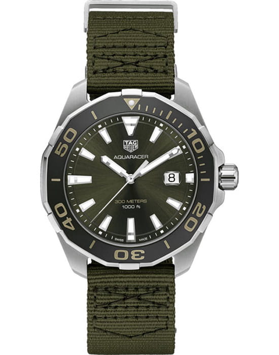TAG Heuer Aquaracer WAY101E.FC8222 – элегантные мужские часы, сочетающие стиль и функциональность. Корпус диаметром 43 мм выполнен из нержавеющей стали с безелемБезельВнешний ободок, закрепляющий стекло. В спортивных часах так называется поворотное кольцо с делениями на циферблате, выполняет роль таймера – замеряет отрезки времени на шкале. Неподвижный безель – элемент декора. Однонаправленно вращающийся безель на дайверских часах позволяет фиксировать моменты погружения и выныривания на поверхность. из алюминия и стали с PVD-покрытиемPVDУльтратонкое покрытие наносится в технике вакуумного напыления, сочетает в себе нитрид титана особой прочности со слоем золота или оксида хрома. Несёт в себе декоративную или защитную функцию., устойчивым к царапинам. Тёмно-зелёный циферблат с солнечным узором оснащён накладными часовыми метками и стрелками с люминесцентным покрытиемЛюминесцентное покрытиеПозволяет считывать показания времени в темноте. Производители наносят на стрелки, часовые индексы, безель или поверхность циферблата светонакопительный состав, дающий холодное свечение., обеспечивающим отличную читаемость в любых условиях освещения. Часы оснащены точным кварцевым механизмом, гарантирующим надёжное отображение времени. Функциональность включает индикацию часов, минут, секунд и даты, расположенной на отметке «3 часа». Сапфировое стеклоСапфировое стеклоПрочный и надёжный материал из кристалла сапфира синтетического происхождения, характеризующийся особой твёрдостью и устойчивостью к царапинам и повреждениям. с антибликовым покрытиемАнтибликовое покрытиеСлой оксида металла в 0,13-0,3 микрон, благодаря которому стекло часов не бликует и не отражает свет. Антибликовое покрытие уменьшает отражение света в 10 раз, обеспечивая отличную читаемость показателей циферблата. обеспечивает защиту от царапин и превосходную читаемость. Тёмно-зелёный нейлоновый ремешок оснащён классической застёжкой-пряжкой из нержавеющей стали. Водозащита до 300 метров (30 бар) делает модель подходящей для дайвинга и других водных видов спорта.