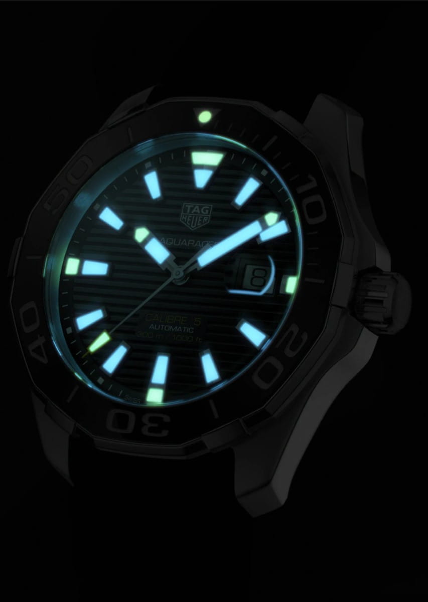 Автоматические мужские часы TAG Heuer Aquaracer Calibre 5 Automatic WAY201A.BA0927, механический механизм (автоматический калибр) с высокой точностью. Сапфировое стеклоСапфировое стеклоПрочный и надёжный материал из кристалла сапфира синтетического происхождения, характеризующийся особой твёрдостью и устойчивостью к царапинам и повреждениям. устойчивое к появлению царапин, обладающее высокой прозрачностью. Класс водозащиты: 300 метров, позволит плавать, нырять и заниматься другими водными видами спорта. Корпус часов изготовлен из стали. Стальной браслет на раскладной застёжкеРаскладная застёжкаТакой тип застёжки используется только на браслетах из металла. Она никогда не раскрывается полностью, происходит разделение на 2 и более частей. Раскладывающая застёжка снизит вероятность потери часов к минимуму.. В механизме 25 или 26 камней в зависимости от исполнения, частота 28800 полуколебаний в час. Запас хода 38 часов. Окошко даты с увеличительным стеклом. Керамический безельБезельВнешний ободок, закрепляющий стекло. В спортивных часах так называется поворотное кольцо с делениями на циферблате, выполняет роль таймера – замеряет отрезки времени на шкале. Неподвижный безель – элемент декора. Однонаправленно вращающийся безель на дайверских часах позволяет фиксировать моменты погружения и выныривания на поверхность. вращается в одном направлении. Завинчивающаяся заводная головка с защитой. Завинчивающаяся задняя крышка. Накладные полированные граненые индексы с родиевым покрытием. Стрелки и метки с люминесцентным покрытиемЛюминесцентное покрытиеПозволяет считывать показания времени в темноте. Производители наносят на стрелки, часовые индексы, безель или поверхность циферблата светонакопительный состав, дающий холодное свечение..