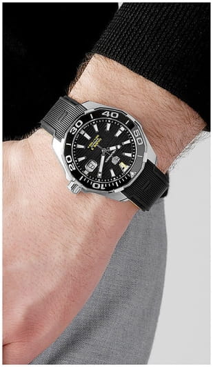TAG Heuer Aquaracer WAY201A.FT6142 — это стильные и надежные часы для активного образа жизни. Корпус диаметром 43 мм выполнен из нержавеющей стали и дополнен безелемБезельВнешний ободок, закрепляющий стекло. В спортивных часах так называется поворотное кольцо с делениями на циферблате, выполняет роль таймера – замеряет отрезки времени на шкале. Неподвижный безель – элемент декора. Однонаправленно вращающийся безель на дайверских часах позволяет фиксировать моменты погружения и выныривания на поверхность. с черной керамической вставкой, обеспечивающей защиту от царапин. Четкие метки и стрелки на черном циферблате покрыты люминесцентным покрытиемЛюминесцентное покрытиеПозволяет считывать показания времени в темноте. Производители наносят на стрелки, часовые индексы, безель или поверхность циферблата светонакопительный состав, дающий холодное свечение., что гарантирует превосходную читаемость в темноте. Циферблат защищает сапфировое стеклоСапфировое стеклоПрочный и надёжный материал из кристалла сапфира синтетического происхождения, характеризующийся особой твёрдостью и устойчивостью к царапинам и повреждениям. с антибликовым покрытиемАнтибликовое покрытиеСлой оксида металла в 0,13-0,3 микрон, благодаря которому стекло часов не бликует и не отражает свет. Антибликовое покрытие уменьшает отражение света в 10 раз, обеспечивая отличную читаемость показателей циферблата.. Внутри установлен автоматический механизм TAG Heuer Calibre 5, обеспечивающий надежную точность хода. Часы комплектуются прочным каучуковым ремешком, а раскладная застёжкаРаскладная застёжкаТакой тип застёжки используется только на браслетах из металла. Она никогда не раскрывается полностью, происходит разделение на 2 и более частей. Раскладывающая застёжка снизит вероятность потери часов к минимуму. с предохранительными кнопками гарантирует надежную фиксацию на запястье. Водонепроницаемость до 300 метров делает модель идеальной для плавания и дайвинга.