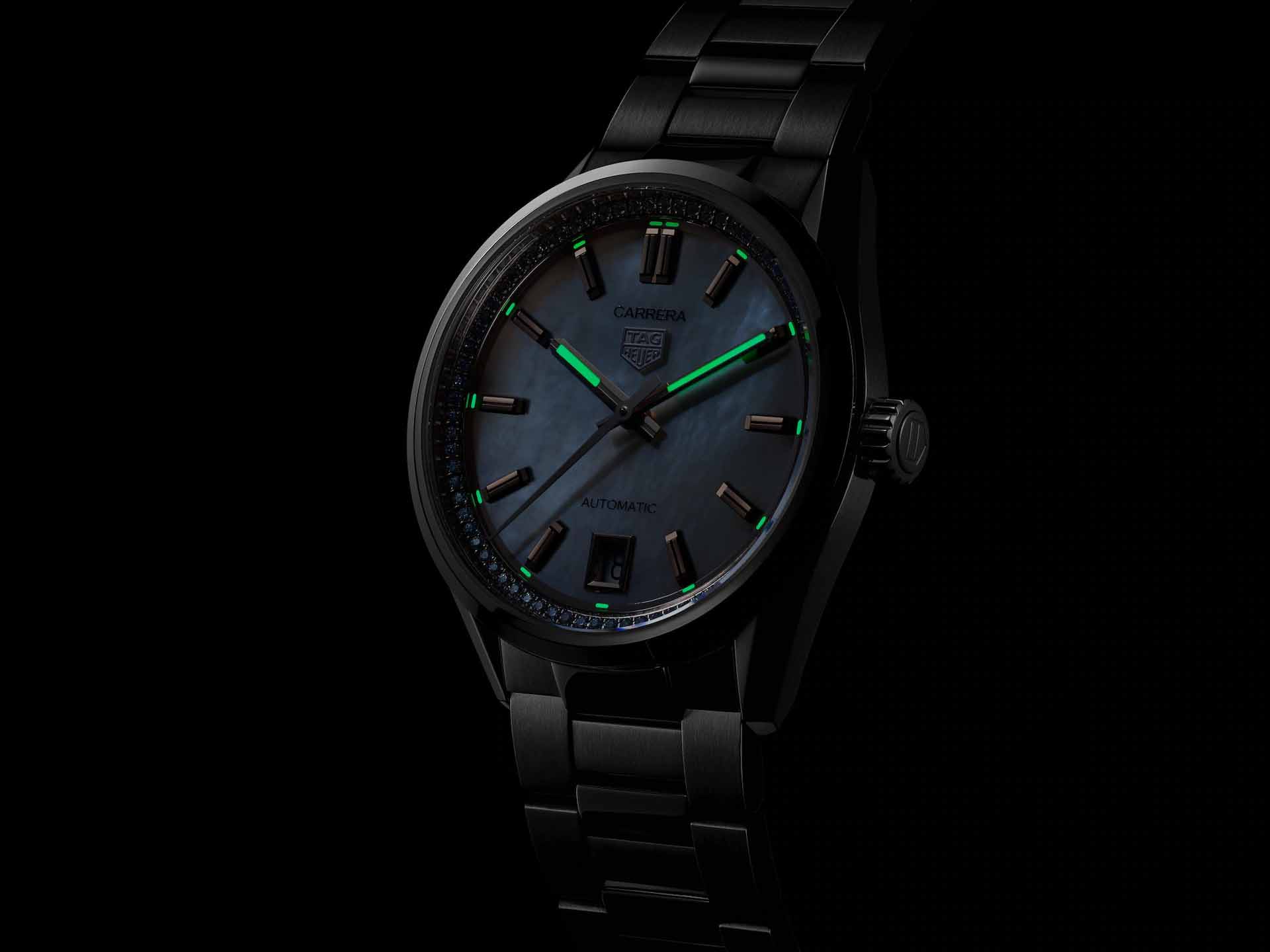 Утончённые часы TAG Heuer Carrera Date WBN2351.BD0000 созданы для стильных и смелых женщин. Механический механизм (автоматический калибр) с высокой точностью производится целиком в стенах компании. Сапфировое стеклоСапфировое стеклоПрочный и надёжный материал из кристалла сапфира синтетического происхождения, характеризующийся особой твёрдостью и устойчивостью к царапинам и повреждениям. устойчивое к появлению царапин, обладающее высокой прозрачностью. На стрелки и метки нанесено люминесцентное покрытиеЛюминесцентное покрытиеПозволяет считывать показания времени в темноте. Производители наносят на стрелки, часовые индексы, безель или поверхность циферблата светонакопительный состав, дающий холодное свечение.. Класс водозащиты: 50 метров, позволит защитить корпус от случайных брызг или капель дождя. Браслет с раскладной застёжкойРаскладная застёжкаТакой тип застёжки используется только на браслетах из металла. Она никогда не раскрывается полностью, происходит разделение на 2 и более частей. Раскладывающая застёжка снизит вероятность потери часов к минимуму.. Апертура даты находится на отметке 6 часов. Неподвижный безельБезельВнешний ободок, закрепляющий стекло. В спортивных часах так называется поворотное кольцо с делениями на циферблате, выполняет роль таймера – замеряет отрезки времени на шкале. Неподвижный безель – элемент декора. Однонаправленно вращающийся безель на дайверских часах позволяет фиксировать моменты погружения и выныривания на поверхность. из 18-каратного золота18-каратное золотоОбозначение по каратной системе пробирования, оно показывает, сколько драгоценного металла содержится в изделии. 18 карат - в составе 75% чистого золота, соответствует 750 пробе.