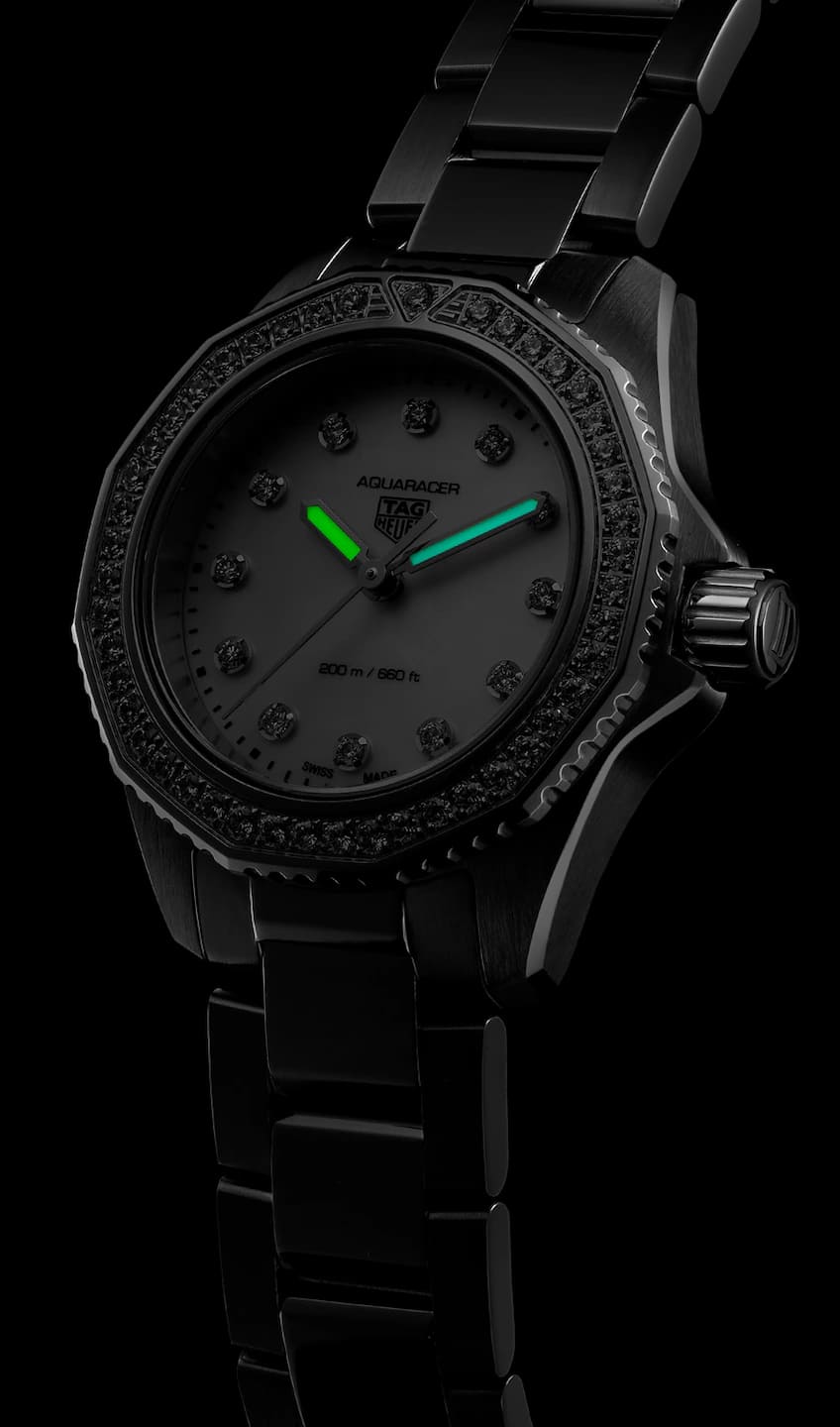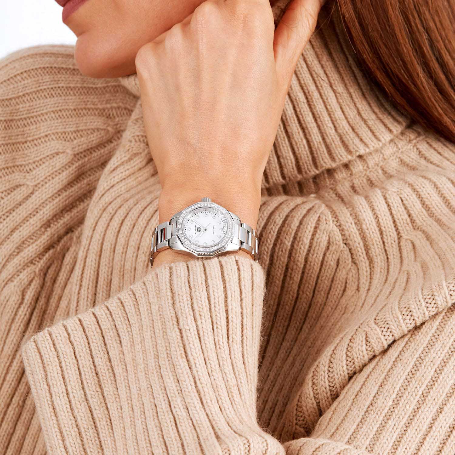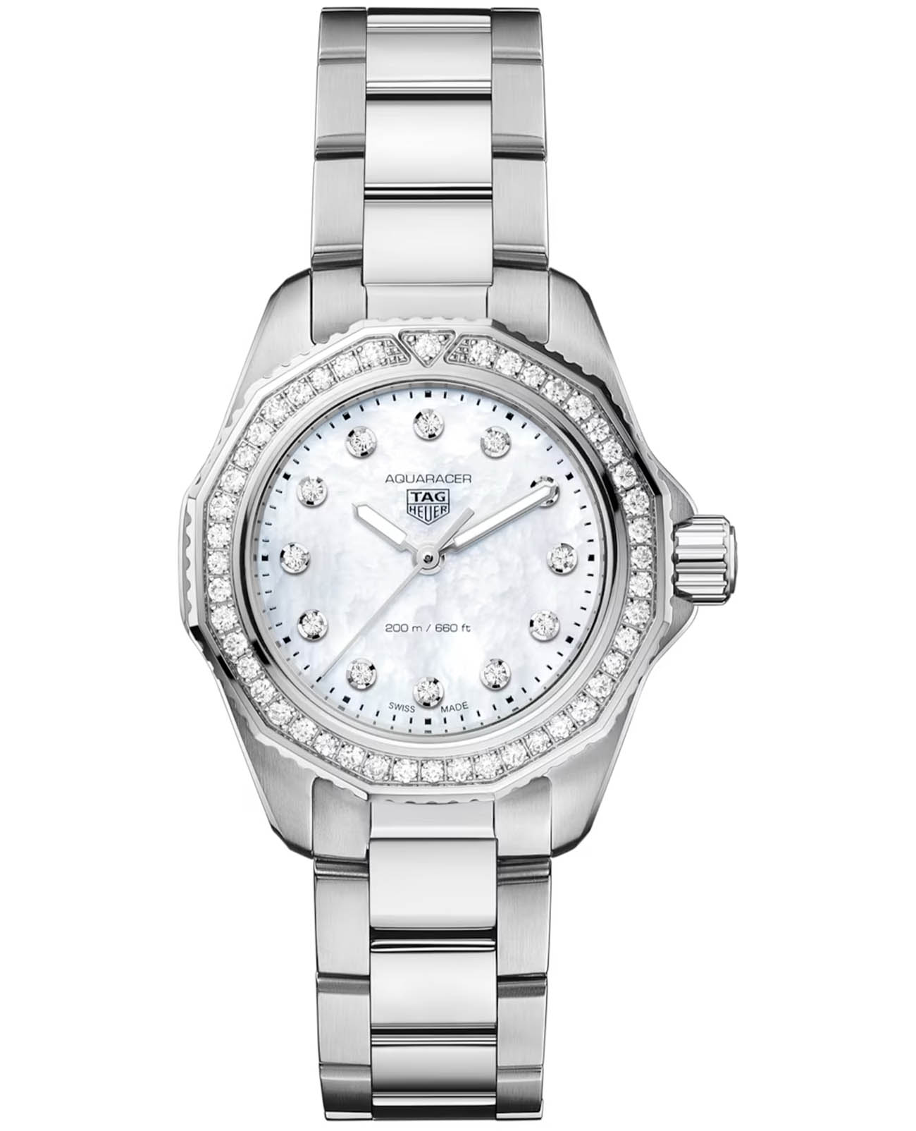 Женские швейцарские часы TAG Heuer Aquaracer Professional 200 WBP1417.BA0622, кварцевый механизм с высокой точностью. Сапфировое стеклоСапфировое стеклоПрочный и надёжный материал из кристалла сапфира синтетического происхождения, характеризующийся особой твёрдостью и устойчивостью к царапинам и повреждениям. устойчивое к появлению царапин, обладающее высокой прозрачностью. Класс водозащиты: 200 метров, позволит плавать, нырять и заниматься другими водными видами спорта. Корпус часов изготовлен из стали. Стальной браслет на раскладной застёжкеРаскладная застёжкаТакой тип застёжки используется только на браслетах из металла. Она никогда не раскрывается полностью, происходит разделение на 2 и более частей. Раскладывающая застёжка снизит вероятность потери часов к минимуму.. Стальной рифленый вращающийся 12-гранный безельБезельВнешний ободок, закрепляющий стекло. В спортивных часах так называется поворотное кольцо с делениями на циферблате, выполняет роль таймера – замеряет отрезки времени на шкале. Неподвижный безель – элемент декора. Однонаправленно вращающийся безель на дайверских часах позволяет фиксировать моменты погружения и выныривания на поверхность. с минутной шкалой выполнен с радиальным сатинированием поверхности. Перламутровый циферблат украшен 12-ю бриллиантами. Прямоугольные стрелки в стиле Baton с люминесцентным покрытиемЛюминесцентное покрытиеПозволяет считывать показания времени в темноте. Производители наносят на стрелки, часовые индексы, безель или поверхность циферблата светонакопительный состав, дающий холодное свечение. Superluminova. Рифленая заводная головка с защитой. Задняя крышка украшена выгравированной 8-лучевой розой ветров на фоне узора сотовой структуры. БезельБезельВнешний ободок, закрепляющий стекло. В спортивных часах так называется поворотное кольцо с делениями на циферблате, выполняет роль таймера – замеряет отрезки времени на шкале. Неподвижный безель – элемент декора. Однонаправленно вращающийся безель на дайверских часах позволяет фиксировать моменты погружения и выныривания на поверхность. и циферблат украшены бриллиантами 0,117К.