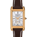Прямоугольный светлый циферблат с римскими цифрами имеет оригинальную детализацию в центре, привлекательно смотрится миниатюрный секундный счётчик. Корпус сделан из 18-каратного золота18-каратное золотоОбозначение по каратной системе пробирования, оно показывает, сколько драгоценного металла содержится в изделии. 18 карат - в составе 75% чистого золота, соответствует 750 пробе.