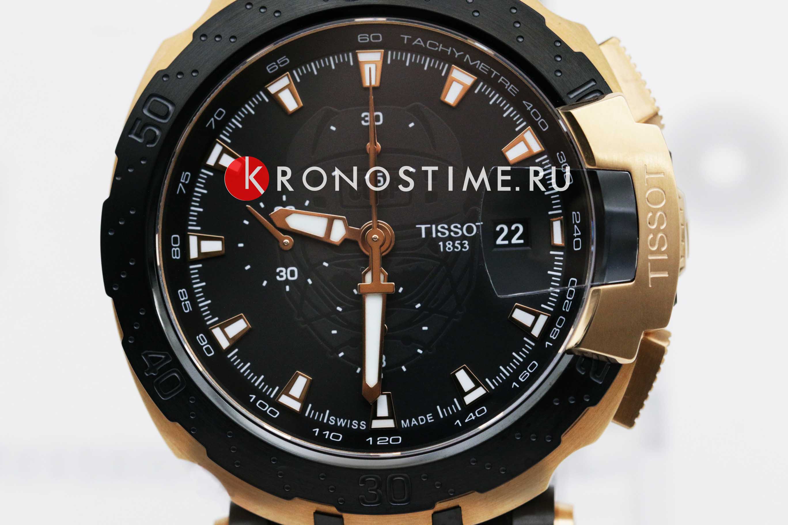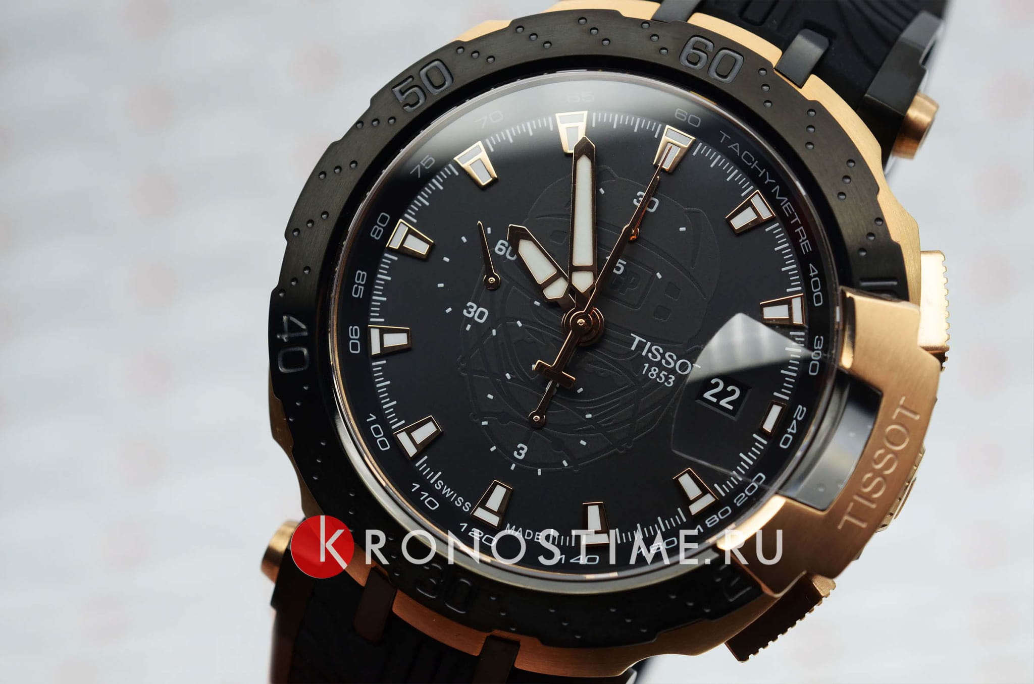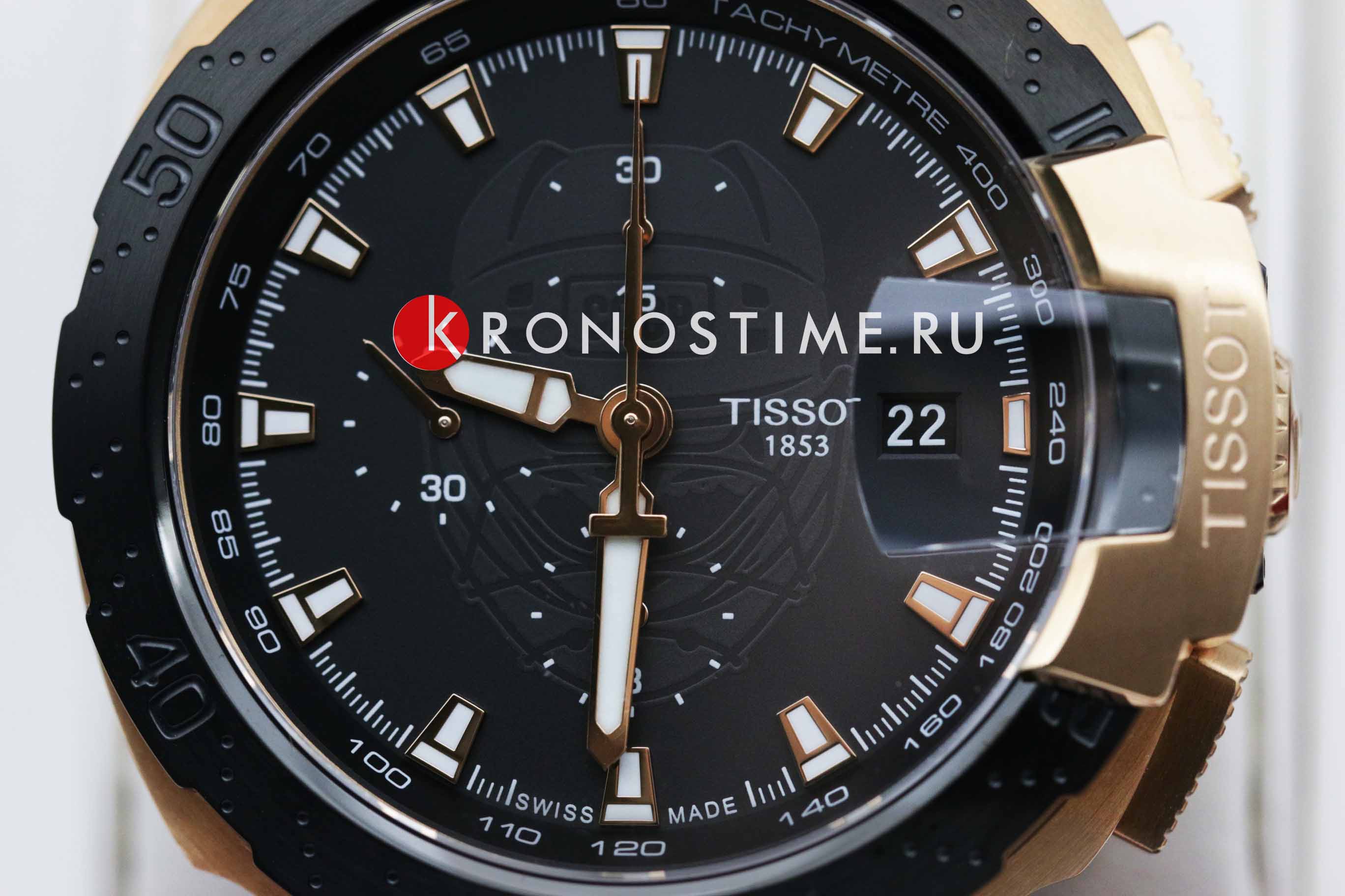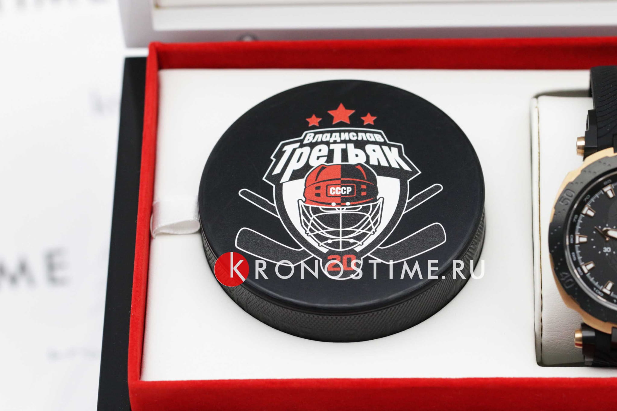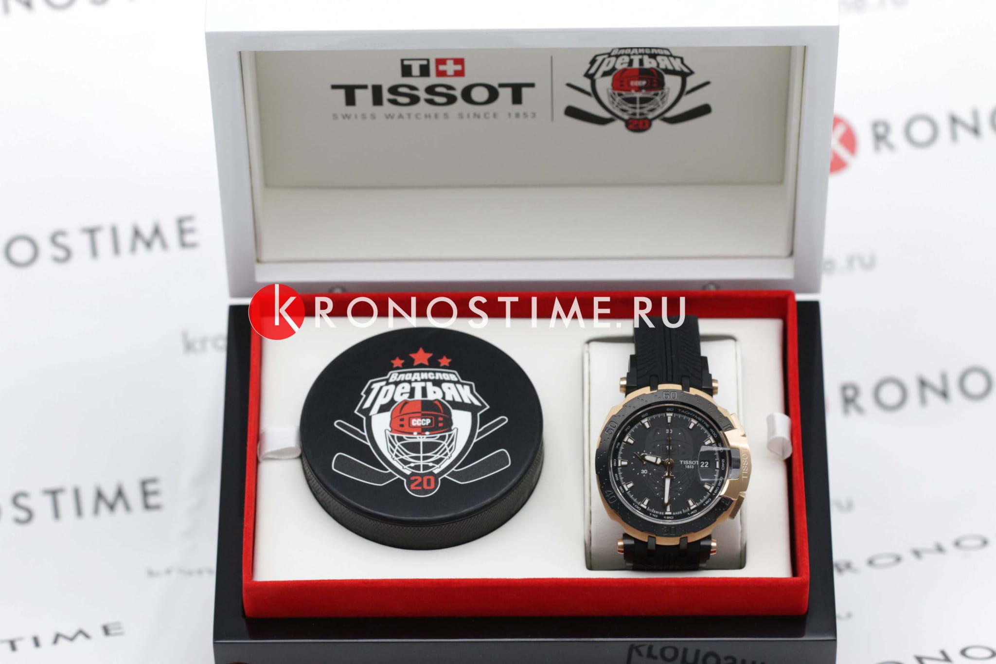 Мужские лимитированные швейцарские механические часы (20 экземпляров на Россию) из коллекции T-Race выпущены в честь легендарного хоккеиста Владислава Третьяка. (Владислав Третьяк — единственный хоккеист, которому удалось три раза получить награду лучшему хоккеисту Европы — «Золотую клюшку». Третьяк завоевал в общей сложности 90 медалей, в числе которых 3 золотые олимпийские, 10 золотых медалей чемпиона мира, 12 золотых — чемпиона Европы.) Часы с автоподзаводом, они оснащены популярным калибром ETA C01.211 с запасом хода 45 часов. Стальной корпус с чёрным и розово-золотистым PVDPVDУльтратонкое покрытие наносится в технике вакуумного напыления, сочетает в себе нитрид титана особой прочности со слоем золота или оксида хрома. Несёт в себе декоративную или защитную функцию.-покрытием. Сапфировое стеклоСапфировое стеклоПрочный и надёжный материал из кристалла сапфира синтетического происхождения, характеризующийся особой твёрдостью и устойчивостью к царапинам и повреждениям.. Удобный силиконовый браслет с раскладной застёжкойРаскладная застёжкаТакой тип застёжки используется только на браслетах из металла. Она никогда не раскрывается полностью, происходит разделение на 2 и более частей. Раскладывающая застёжка снизит вероятность потери часов к минимуму.. Люминесцентное покрытиеЛюминесцентное покрытиеПозволяет считывать показания времени в темноте. Производители наносят на стрелки, часовые индексы, безель или поверхность циферблата светонакопительный состав, дающий холодное свечение.. Водостойкость до 10 бар. СекундомерСекундомерСекундоме́р — прибор, способный измерять интервалы времени с точностью до долей секунды., тахиметрТахиметрРазмеченная шкала, располагается на ободке или безеле часов. Тахиметр позволяет рассчитать скорость на определённом участке пути, расстояние измеряется в километрах или милях., индикация числа. Габариты: 47,25 x 45 x 16 мм. Производство и сборка: Швейцария.