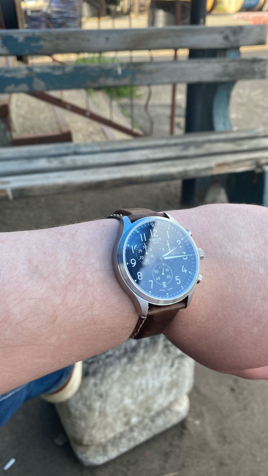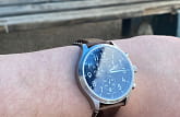 С хронографом, можно плавать в них (водозащита даёт это сделать, до 100м.), кожаный ремешок с белой строчкой. Показывают дату.