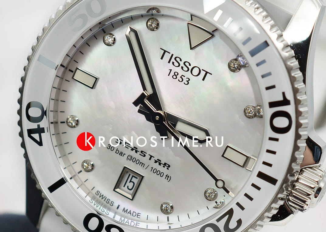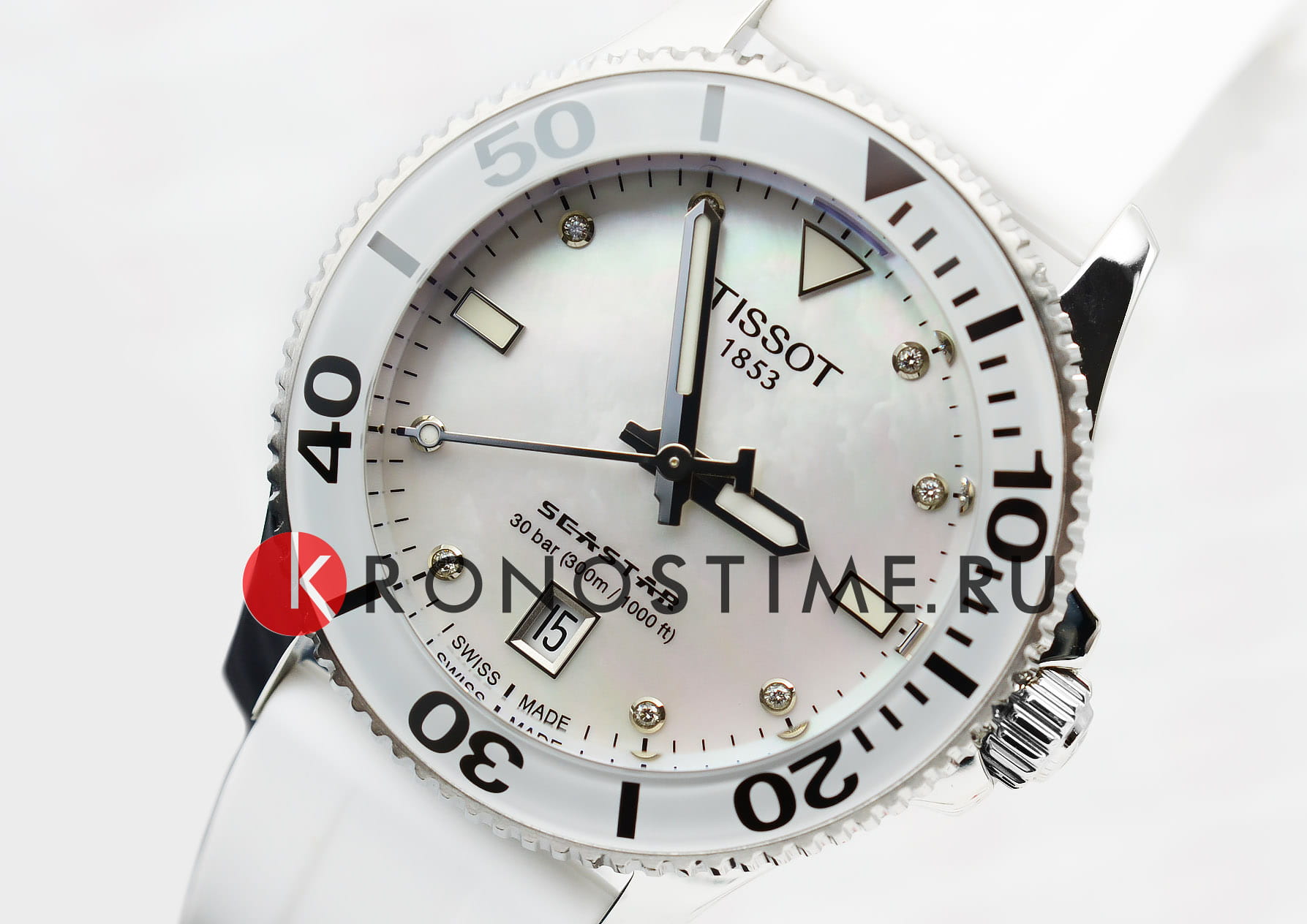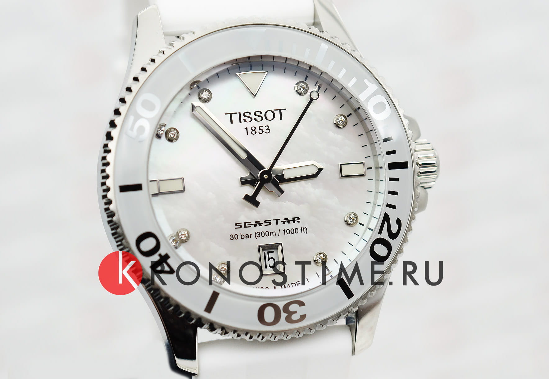 Женские швейцарские часы с кварцевым механизмом Tissot Seastar 1000 T120.210.17.116.00, кварцевый механизм с высокой точностью. Сапфировое стеклоСапфировое стеклоПрочный и надёжный материал из кристалла сапфира синтетического происхождения, характеризующийся особой твёрдостью и устойчивостью к царапинам и повреждениям. устойчивое к появлению царапин, обладающее высокой прозрачностью. Класс водозащиты: 300 метров, позволит плавать, нырять и заниматься другими водными видами спорта. Вращающийся безельБезельВнешний ободок, закрепляющий стекло. В спортивных часах так называется поворотное кольцо с делениями на циферблате, выполняет роль таймера – замеряет отрезки времени на шкале. Неподвижный безель – элемент декора. Однонаправленно вращающийся безель на дайверских часах позволяет фиксировать моменты погружения и выныривания на поверхность.. Корпус часов изготовлен из нержавеющий стали.