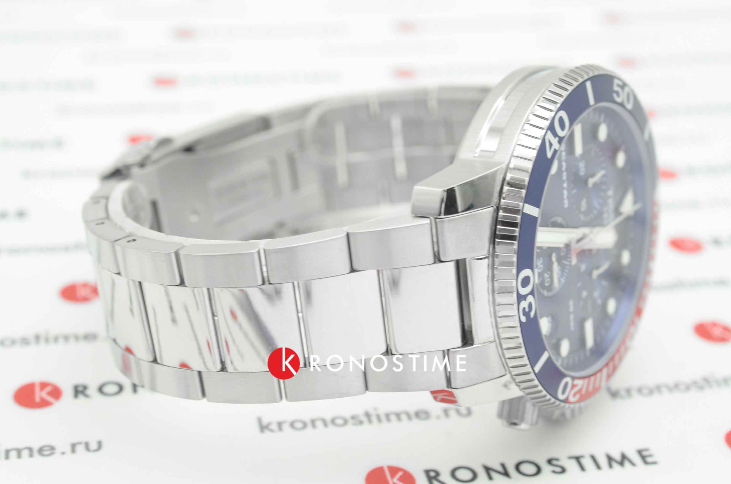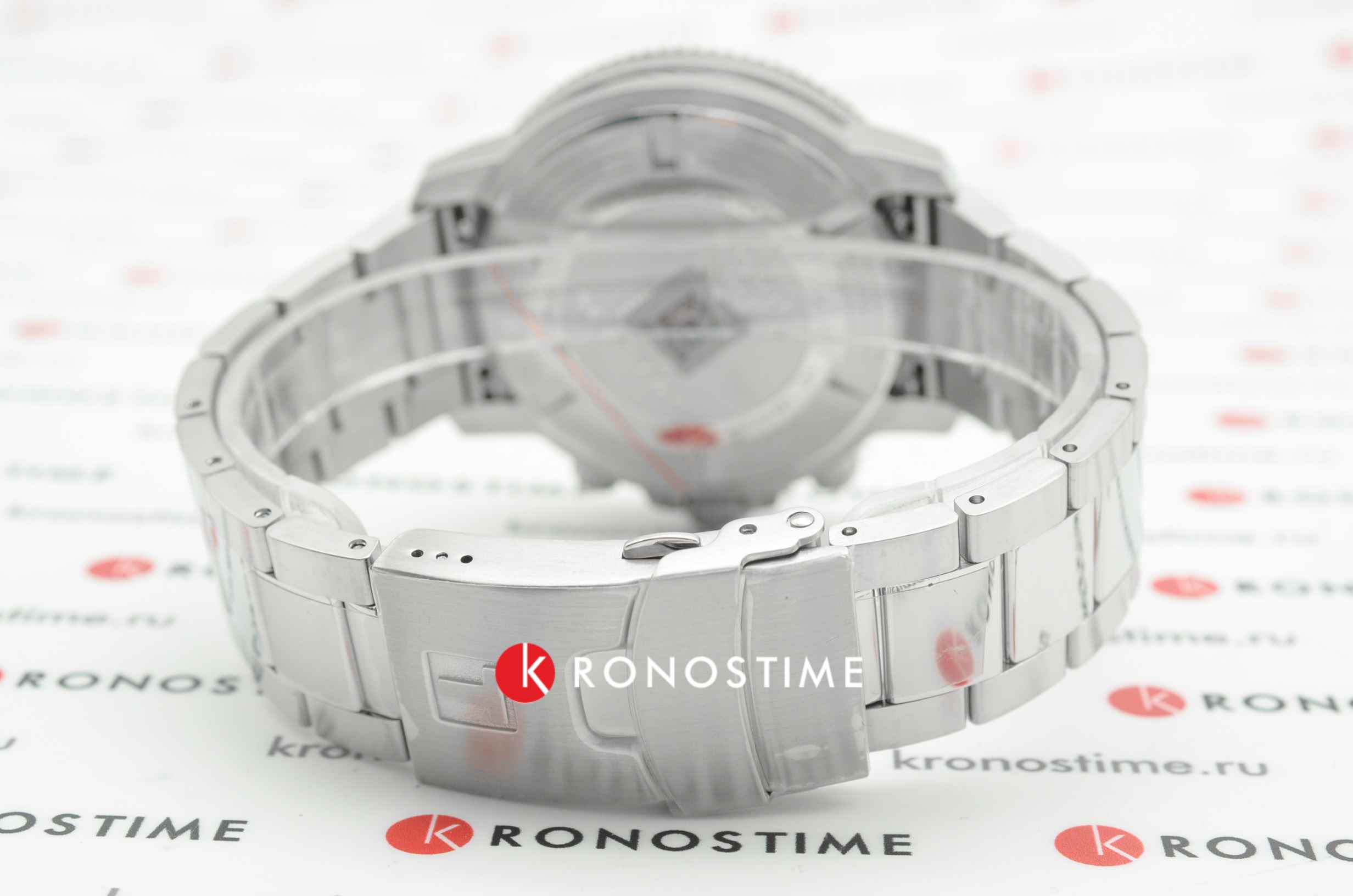 Дайверские часы отличаются повышенным уровнем водостойкости, герметичность сохраняется при давлении 30 бар на глубине 300 метров. Этому дополнительно способствуют заводная головка с завинчивающейся системой. Стекло из сапфира с антибликовым слоем невозможно поцарапать. Кварцевый калибр ETA G10.212. Люминесцентная подсветкаЛюминесцентное покрытиеПозволяет считывать показания времени в темноте. Производители наносят на стрелки, часовые индексы, безель или поверхность циферблата светонакопительный состав, дающий холодное свечение.. ХронографХронографФункция позволяет измерять отрезки времени с особой точностью: часы, минуты, секунды. Верным признаком хронографа является наличие на циферблате 3 дополнительных окошек-счётчиков., секундомер, календарь. Застёжка с удлинением для дайверского костюмаУдлинение для дайверовЗастёжка с удлинением для дайверов представляет собой безопасное крепление, которое позволяет надевать часы поверх гидрокостюма. Гибкая застёжка удлиняется на 1-2 миллиметра.. Габариты: 45 x 45 x 12,8 мм.