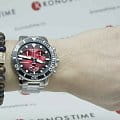 На фоне серебристого браслета и темного безеляБезельВнешний ободок, закрепляющий стекло. В спортивных часах так называется поворотное кольцо с делениями на циферблате, выполняет роль таймера – замеряет отрезки времени на шкале. Неподвижный безель – элемент декора. Однонаправленно вращающийся безель на дайверских часах позволяет фиксировать моменты погружения и выныривания на поверхность. ярко выделяется красный циферблат, отлично видны серебристые стрелки и часовые метки с люминесцентным покрытиемЛюминесцентное покрытиеПозволяет считывать показания времени в темноте. Производители наносят на стрелки, часовые индексы, безель или поверхность циферблата светонакопительный состав, дающий холодное свечение.. Завинчивающиеся кнопки, головка, прозрачная задняя крышка. Сапфировое стекло. Апертура даты. Габариты: 43 x 43 x 12,7 мм.