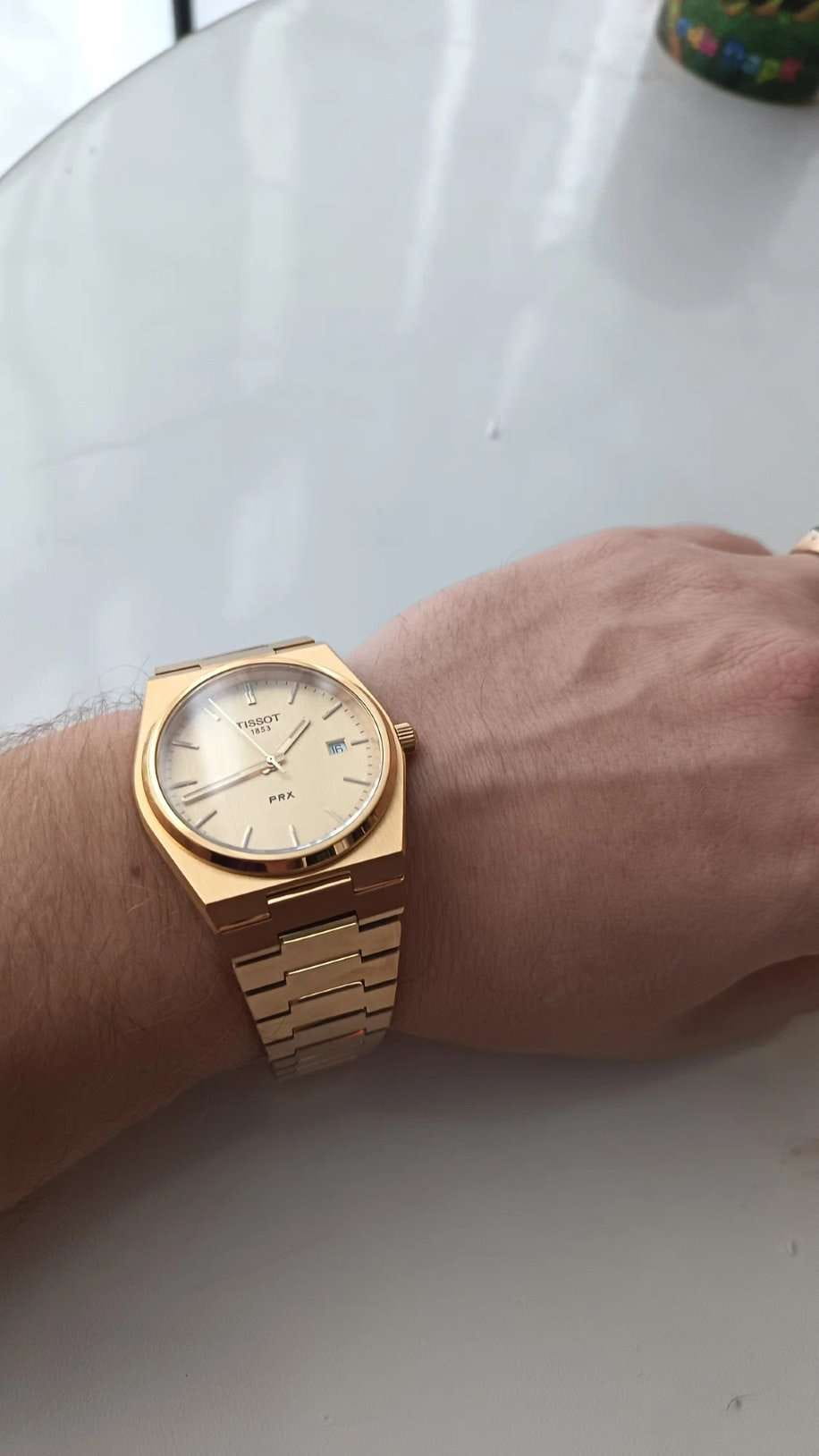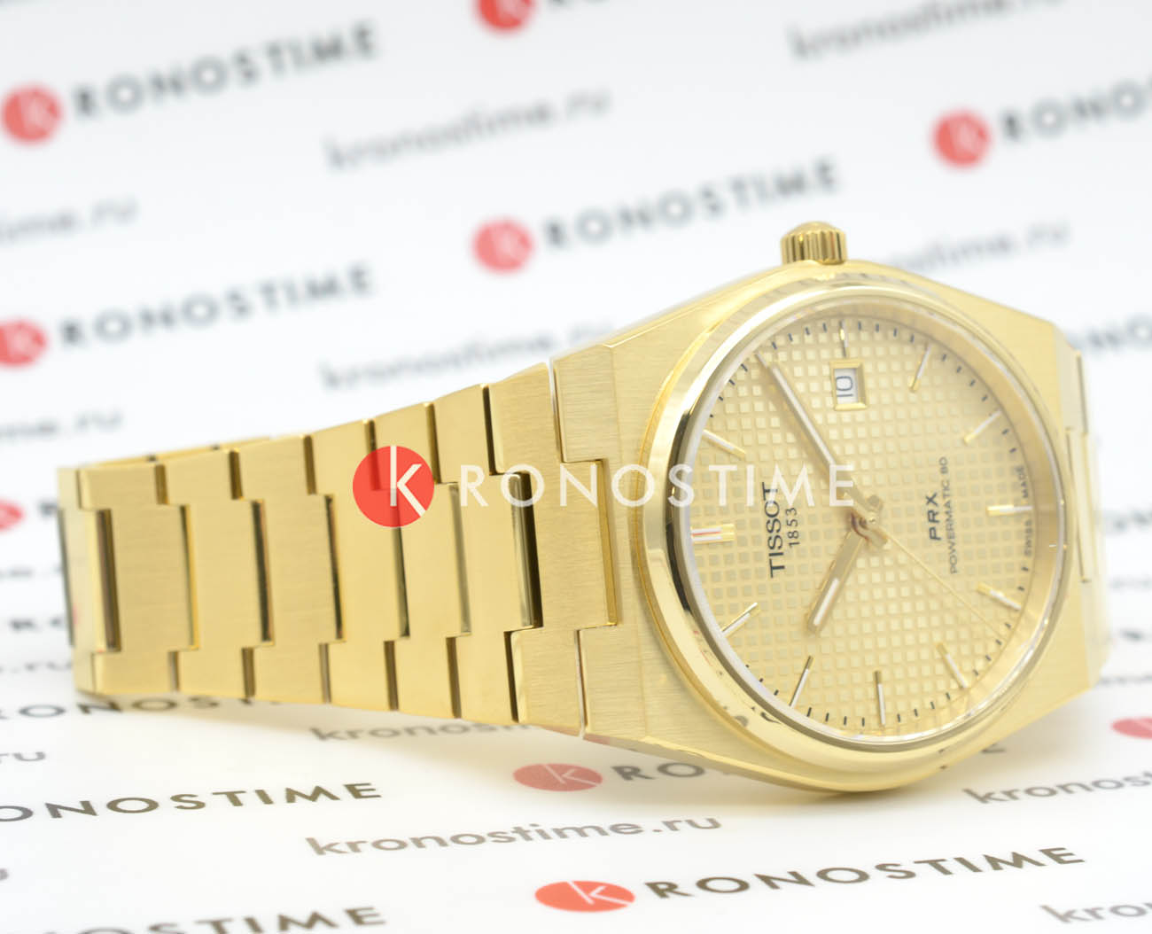 Tissot PRX Powermatic 80 (модель T137.407.33.021.00) – это элегантные часы, сочетающие современный дизайн с высокими технологиями. Корпус диаметром 40 мм выполнен из нержавеющей стали 316L с жёлтым PVD-покрытиемPVDУльтратонкое покрытие наносится в технике вакуумного напыления, сочетает в себе нитрид титана особой прочности со слоем золота или оксида хрома. Несёт в себе декоративную или защитную функцию., придающим часам роскошный вид. Шампанского оттенка циферблат украшен узором "шашечки" и защищён сапфировым стекломСапфировое стеклоПрочный и надёжный материал из кристалла сапфира синтетического происхождения, характеризующийся особой твёрдостью и устойчивостью к царапинам и повреждениям. с антибликовым покрытиемАнтибликовое покрытиеСлой оксида металла в 0,13-0,3 микрон, благодаря которому стекло часов не бликует и не отражает свет. Антибликовое покрытие уменьшает отражение света в 10 раз, обеспечивая отличную читаемость показателей циферблата., устойчивым к царапинам. Часы оснащены автоматическим механизмом Powermatic 80Powermatic 80Эксклюзивный калибр от швейцарской компании ETA с увеличенным запасом хода до 80 часов за счёт удлинённой заводной пружины. Характеризуется улучшенной системой спуска со сниженным трением. с запасом хода до 80 часов и антимагнитной спиралью баланса из сплава Nivachron™Nivachron™Специально разработанный инновационный сплав Nivachron™ повышает устойчивость часов к воздействию магнитных полей., обеспечивающей высокую точность хода. Браслет из нержавеющей стали с жёлтым PVD-покрытием оснащён застёжкой 'бабочка'Застёжка "бабочка"Такой вид застёжки дополняется предохранителями, помогающими избежать случайного раскрытия браслета. Обладают изящным исполнением. , обеспечивающей надёжную фиксацию и комфорт при ношении. Водонепроницаемость до 10 бар (100 метров) позволяет использовать часы при плавании и других водных активностях.