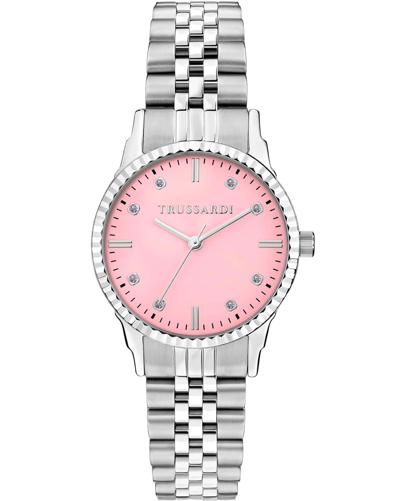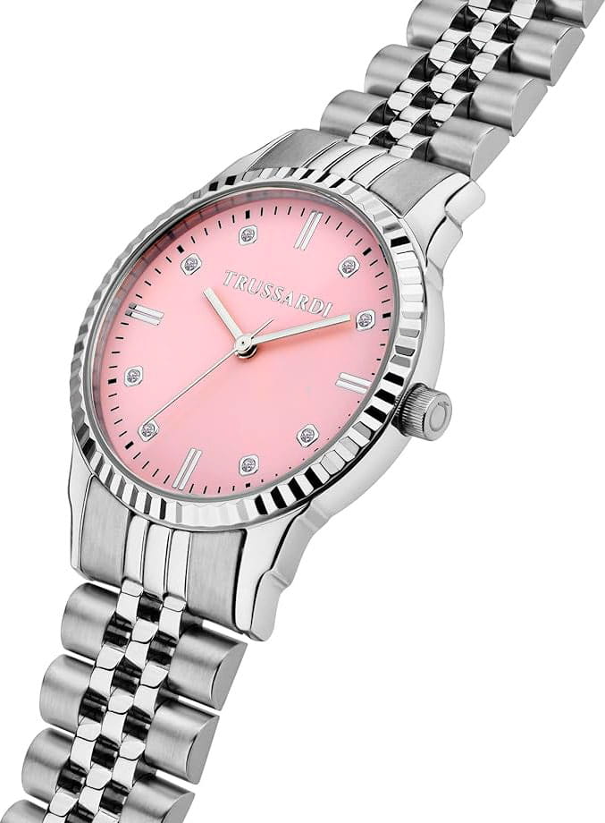 Итальянские женские часы Trussardi T-Bent R2453144510 - это стильный женский аксессуар, который сочетает элегантный дизайн и практичность. Корпус выполнен из нержавеющей стали, что обеспечивает долговечность и утончённый внешний вид. БезельБезельВнешний ободок, закрепляющий стекло. В спортивных часах так называется поворотное кольцо с делениями на циферблате, выполняет роль таймера – замеряет отрезки времени на шкале. Неподвижный безель – элемент декора. Однонаправленно вращающийся безель на дайверских часах позволяет фиксировать моменты погружения и выныривания на поверхность. с алмазной гранью. Надежное минеральное стеклоМинеральное стеклоМинеральное стекло представляет собой искусственно выращенный минерал кварца. Такое стекло отличается особой устойчивостью к повреждениям и царапинам. Уступает по некоторым качествам сапфировому стеклу. защищает циферблат с кристаллами от царапин и обеспечивает долговечность. Модель оснащена кварцевым механизмом, обеспечивающим высокую точность хода. Браслет из нержавеющей стали на раскладной застёжкеРаскладная застёжкаТакой тип застёжки используется только на браслетах из металла. Она никогда не раскрывается полностью, происходит разделение на 2 и более частей. Раскладывающая застёжка снизит вероятность потери часов к минимуму. обеспечивает комфортное ношение. Водозащита 50 метров позволит защитить корпус от случайных брызг или капель дождя. Эта модель – отличный выбор для тех, кто ищет сочетание стиля, качества и функциональности. Часы станут не только полезным аксессуаром, но и выразительным элементом вашего имиджа.