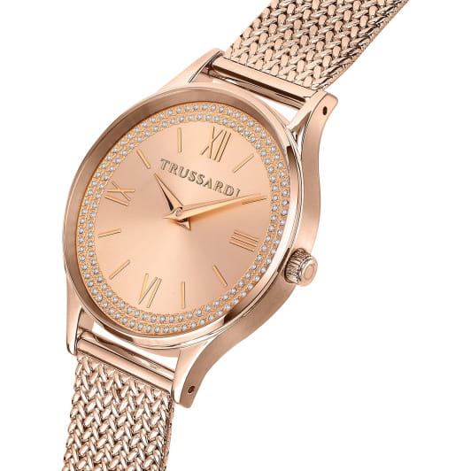 Итальянские женские часы Trussardi T-Star R2453152505 - это стильный женский аксессуар, который сочетает элегантный дизайн и практичность. Корпус выполнен из нержавеющей стали с IP-покрытиемIP-покрытиеМетод ионного напыления. Демонстрирует повышенную устойчивость к истиранию, окислению и химическим веществам. Под воздействием высокого давления и температуры около 1500°C молекулы металла надёжно соединяются с частицами корпуса часов., что обеспечивает долговечность и утончённый внешний вид. Надежное минеральное стеклоМинеральное стеклоМинеральное стекло представляет собой искусственно выращенный минерал кварца. Такое стекло отличается особой устойчивостью к повреждениям и царапинам. Уступает по некоторым качествам сапфировому стеклу. защищает циферблат от царапин и обеспечивает долговечность. Циферблат украшен кристаллами. Модель оснащена кварцевым механизмом, обеспечивающим высокую точность хода. Браслет из нержавеющей стали с IP-покрытиемIP-покрытиеМетод ионного напыления. Демонстрирует повышенную устойчивость к истиранию, окислению и химическим веществам. Под воздействием высокого давления и температуры около 1500°C молекулы металла надёжно соединяются с частицами корпуса часов. с раскладным замкомРаскладной замокДанный вариант застежки используется только на часах с металлическим браслетом. Отличительная особенность такого крепления в том, что длина браслета становится универсальной и вы можете самостоятельно отрегулировать нужный вам размер – застежка просто двигается по браслету часов. обеспечивает комфортное ношение. Водозащита 50 метров позволит защитить корпус от случайных брызг или капель дождя. Эта модель – отличный выбор для тех, кто ищет сочетание стиля, качества и функциональности. Часы станут не только полезным аксессуаром, но и выразительным элементом вашего имиджа.