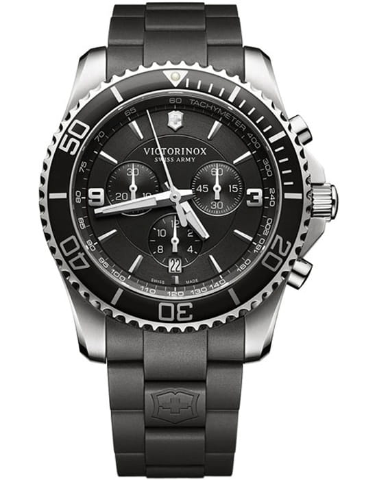 Мужские швейцарские часы- хронографХронографФункция позволяет измерять отрезки времени с особой точностью: часы, минуты, секунды. Верным признаком хронографа является наличие на циферблате 3 дополнительных окошек-счётчиков. Victorinox Maverick 241696, кварцевый механизм с высокой точностью. Сапфировое стеклоСапфировое стеклоПрочный и надёжный материал из кристалла сапфира синтетического происхождения, характеризующийся особой твёрдостью и устойчивостью к царапинам и повреждениям. с трёхслойным антибликовым покрытием. Часы с секундомеромСекундомерСекундоме́р — прибор, способный измерять интервалы времени с точностью до долей секунды. и тахиметромТахиметрРазмеченная шкала, располагается на ободке или безеле часов. Тахиметр позволяет рассчитать скорость на определённом участке пути, расстояние измеряется в километрах или милях.. Корпус часов выполнен из нержавеющей стали 316L. Вращающийся стальной безельБезельВнешний ободок, закрепляющий стекло. В спортивных часах так называется поворотное кольцо с делениями на циферблате, выполняет роль таймера – замеряет отрезки времени на шкале. Неподвижный безель – элемент декора. Однонаправленно вращающийся безель на дайверских часах позволяет фиксировать моменты погружения и выныривания на поверхность. с PVD-покрытиемPVDУльтратонкое покрытие наносится в технике вакуумного напыления, сочетает в себе нитрид титана особой прочности со слоем золота или оксида хрома. Несёт в себе декоративную или защитную функцию.. Стрелки с люминесцентным покрытиемЛюминесцентное покрытиеПозволяет считывать показания времени в темноте. Производители наносят на стрелки, часовые индексы, безель или поверхность циферблата светонакопительный состав, дающий холодное свечение.. Класс водозащиты: 100 метров, позволит плавать, нырять и заниматься другими водными видами спорта. Каучковый ремешок на стандартной застежке.