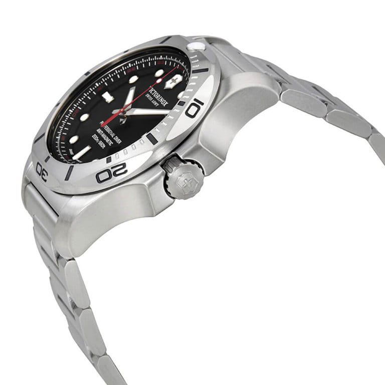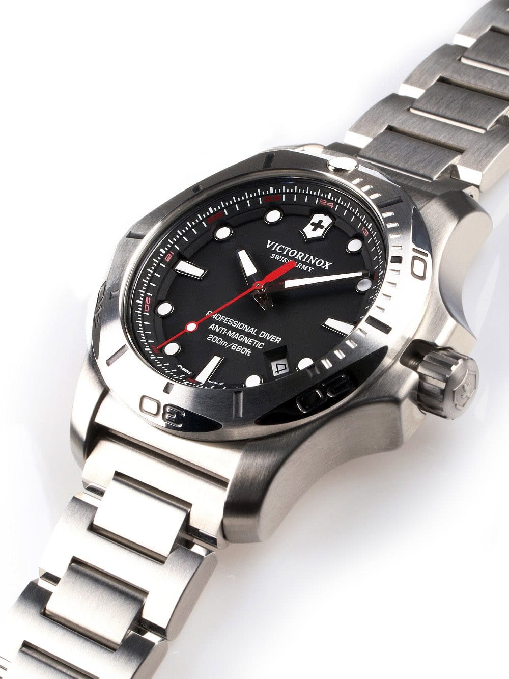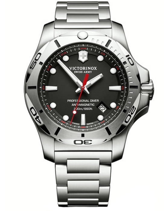 Мужские швейцарские часы Victorinox I.N.O.X. Professional Diver 241781, кварцевый механизм с высокой точностью. Сапфировое стеклоСапфировое стеклоПрочный и надёжный материал из кристалла сапфира синтетического происхождения, характеризующийся особой твёрдостью и устойчивостью к царапинам и повреждениям. с трёхслойным антибликовым покрытием. Корпус часов выполнен из нержавеющей стали. Вращающийся стальной безельБезельВнешний ободок, закрепляющий стекло. В спортивных часах так называется поворотное кольцо с делениями на циферблате, выполняет роль таймера – замеряет отрезки времени на шкале. Неподвижный безель – элемент декора. Однонаправленно вращающийся безель на дайверских часах позволяет фиксировать моменты погружения и выныривания на поверхность.. Стрелки и метки с люминесцентным покрытиемЛюминесцентное покрытиеПозволяет считывать показания времени в темноте. Производители наносят на стрелки, часовые индексы, безель или поверхность циферблата светонакопительный состав, дающий холодное свечение.. Класс водозащиты: 200 метров, позволит плавать, нырять и заниматься другими водными видами спорта. Стальной браслет на раскладной застёжкеРаскладная застёжкаТакой тип застёжки используется только на браслетах из металла. Она никогда не раскрывается полностью, происходит разделение на 2 и более частей. Раскладывающая застёжка снизит вероятность потери часов к минимуму..
