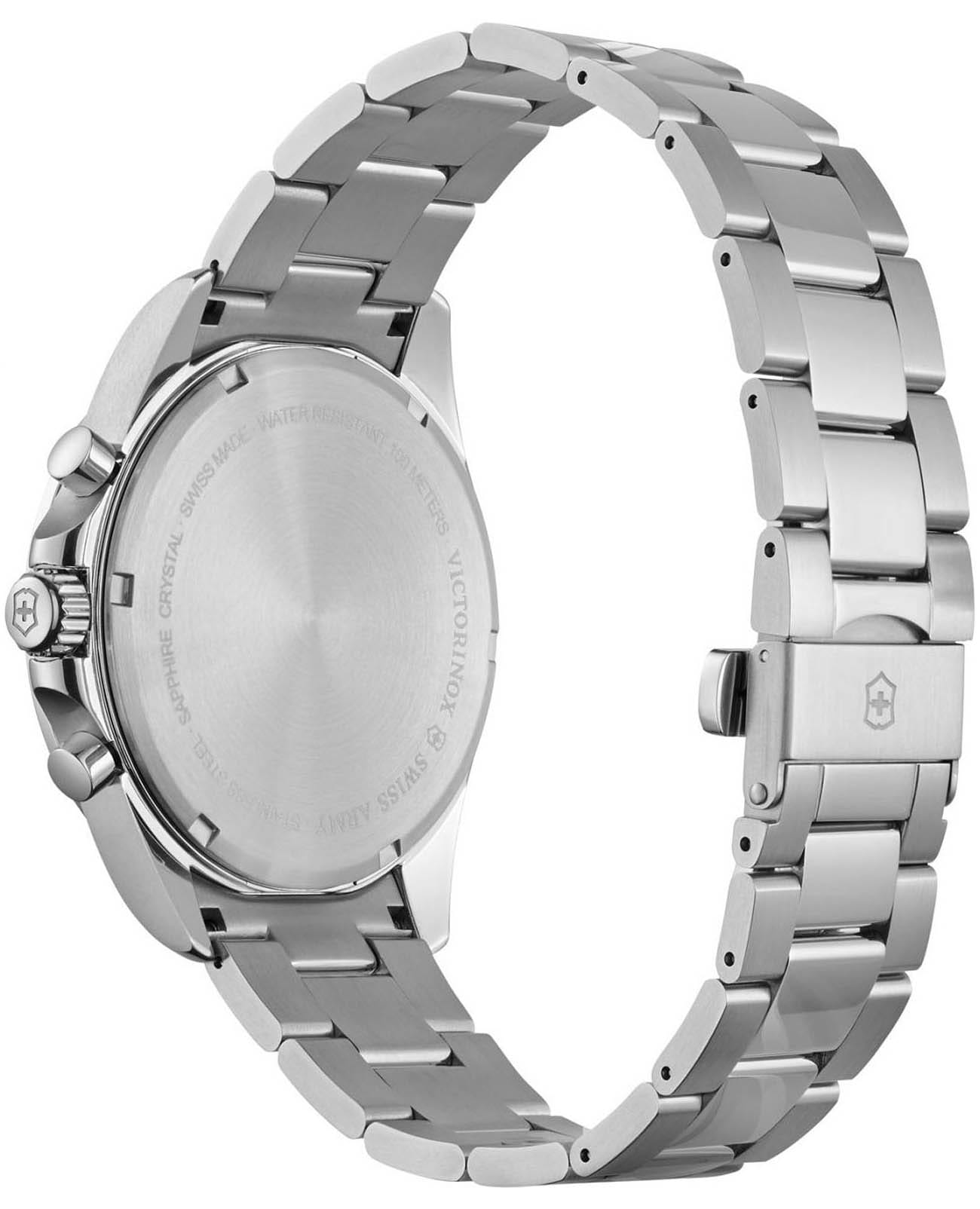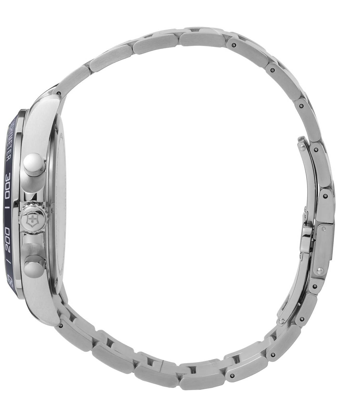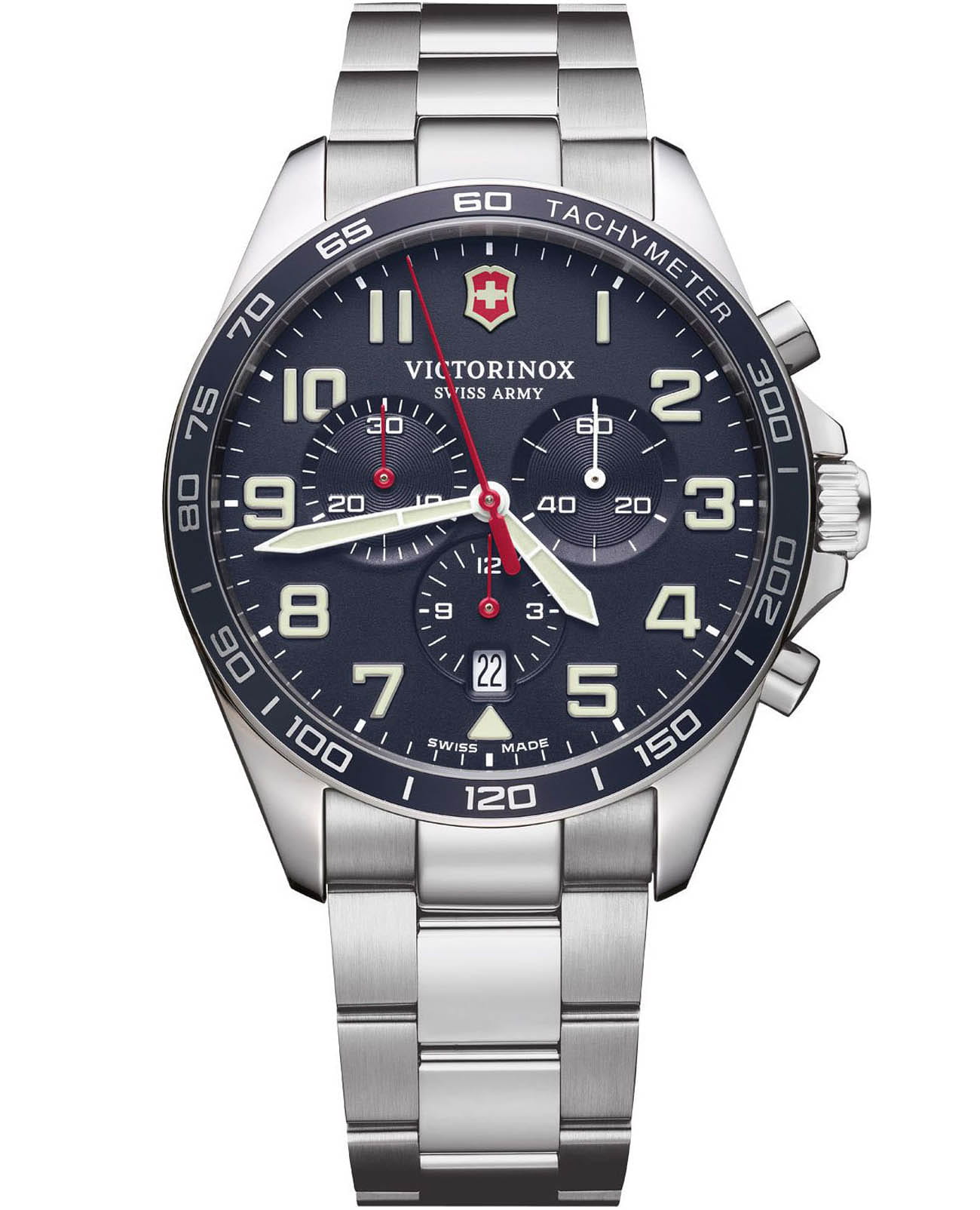 Мужские швейцарские часы-хронографХронографФункция позволяет измерять отрезки времени с особой точностью: часы, минуты, секунды. Верным признаком хронографа является наличие на циферблате 3 дополнительных окошек-счётчиков. Victorinox Fieldforce Chronograph 241857 с надёжным кварцевым механизмом. Сапфировое стеклоСапфировое стеклоПрочный и надёжный материал из кристалла сапфира синтетического происхождения, характеризующийся особой твёрдостью и устойчивостью к царапинам и повреждениям. с трёхслойным антибликовым покрытием. Корпус часов выполнен из нержавеющей стали 316L. Стальной браслет на раскладной застёжкеРаскладная застёжкаТакой тип застёжки используется только на браслетах из металла. Она никогда не раскрывается полностью, происходит разделение на 2 и более частей. Раскладывающая застёжка снизит вероятность потери часов к минимуму.. Влагозащита: 100 метров, позволит плавать, нырять и заниматься другими водными видами спорта. Окошко даты находится в положении 6 часов, стрелки и метки с люминесцентным покрытиемЛюминесцентное покрытиеПозволяет считывать показания времени в темноте. Производители наносят на стрелки, часовые индексы, безель или поверхность циферблата светонакопительный состав, дающий холодное свечение., тахиметрТахиметрРазмеченная шкала, располагается на ободке или безеле часов. Тахиметр позволяет рассчитать скорость на определённом участке пути, расстояние измеряется в километрах или милях..