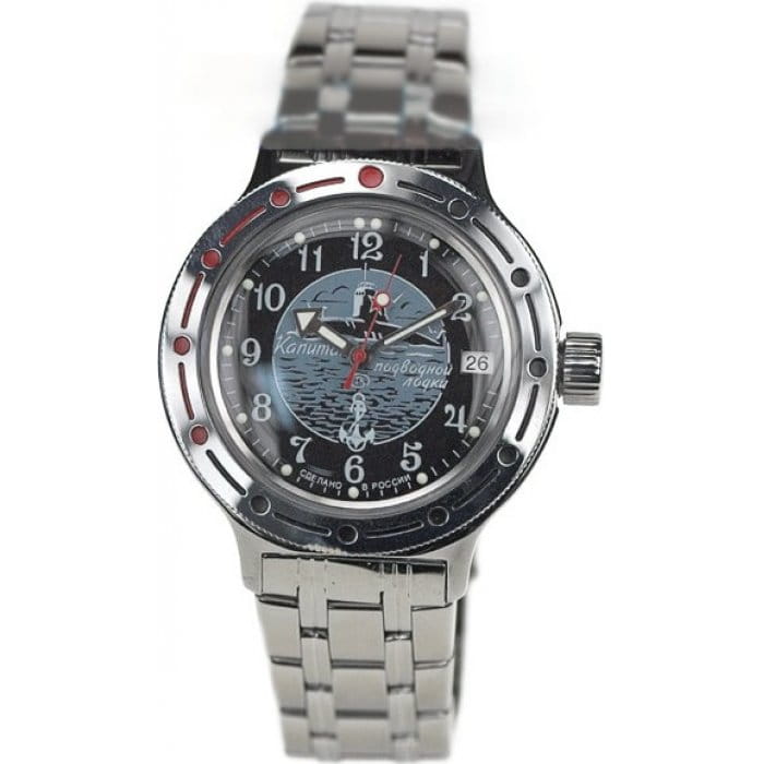 Эти практичные часы великолепно сидят на руке и позволят вам чувствовать себя уверенно в любой обстановке. Амфибия Классика. В механизме 31 камень, частота 19800 полуколебаний в час. Запас хода 31 час. Противоударное устройство оси баланса. Браслет с раскладывающейся застежкой.