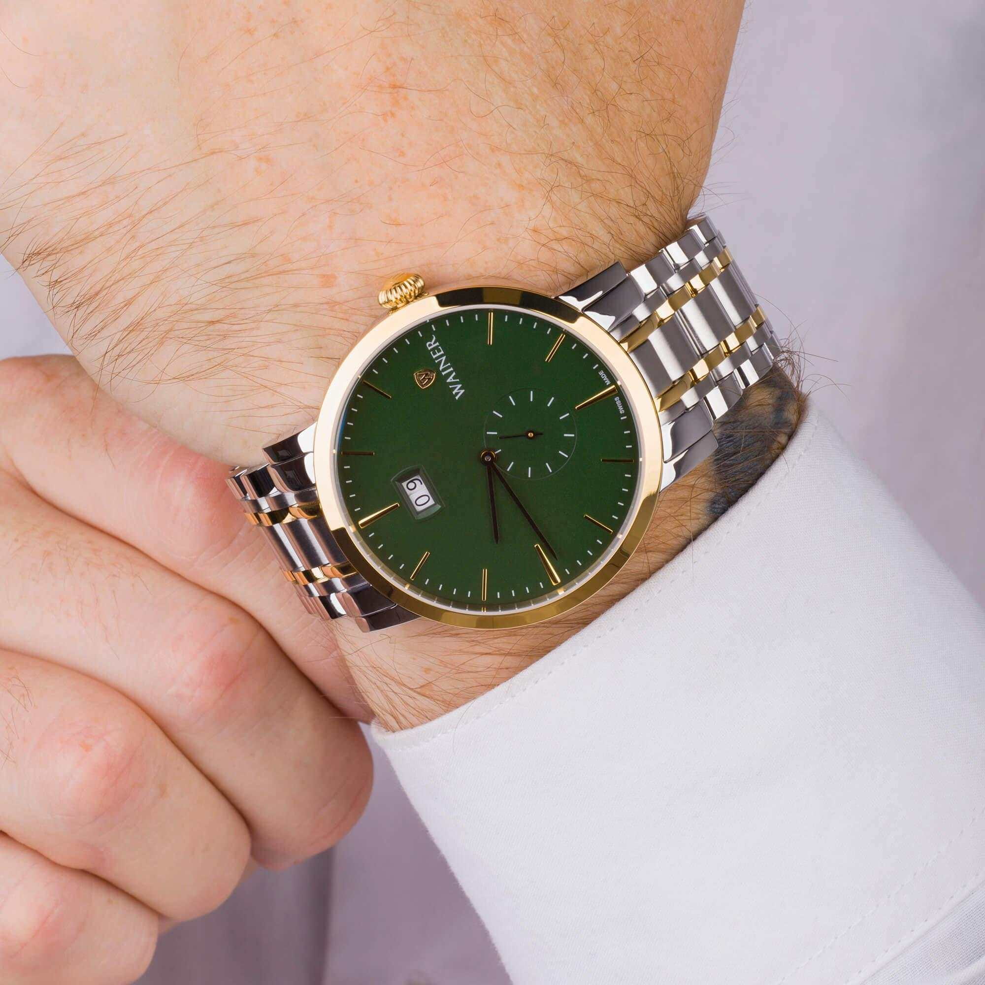 Мужские кварцевые часы. Калибр механизма Ronda 6004.B. Центральные часовая и минутная стрелки, секундная стрелка вынесена на малый циферблат. Большая дата в позиции 12 часов. Зеленый циферблат. Круглый корпус выполнен из нержавеющей стали 316L. Диаметр корпуса составляет 44 мм, толщина 10 мм. Стальной браслет с частичным PVD-покрытиемPVDУльтратонкое покрытие наносится в технике вакуумного напыления, сочетает в себе нитрид титана особой прочности со слоем золота или оксида хрома. Несёт в себе декоративную или защитную функцию., раскладная застёжкаРаскладная застёжкаТакой тип застёжки используется только на браслетах из металла. Она никогда не раскрывается полностью, происходит разделение на 2 и более частей. Раскладывающая застёжка снизит вероятность потери часов к минимуму.. Устойчивое к возникновению царапин сапфировое стеклоСапфировое стеклоПрочный и надёжный материал из кристалла сапфира синтетического происхождения, характеризующийся особой твёрдостью и устойчивостью к царапинам и повреждениям.. Водостойкость -- 50 метров, позволит защитить корпус от случайных брызг или капель дождя. Вес примерно 150 г.