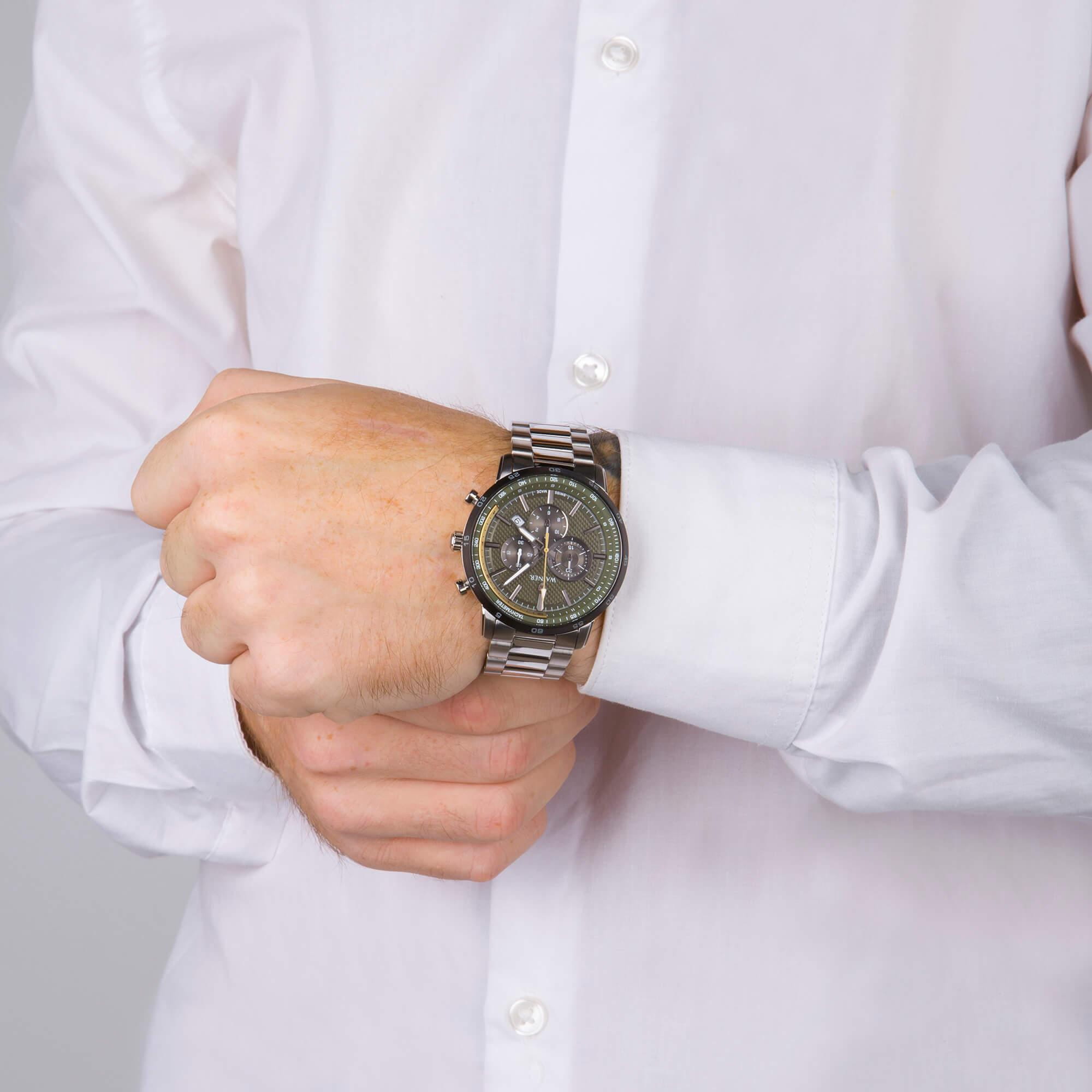 Мужские наручные часы-хронографХронографФункция позволяет измерять отрезки времени с особой точностью: часы, минуты, секунды. Верным признаком хронографа является наличие на циферблате 3 дополнительных окошек-счётчиков. WA.19032-E с надежным кварцевым механизмом. Корпус часов изготовлен из нержавеющей стали 316L. Стальной браслет на застежке "бабочке". Окошко даты находится в между 4 и 5 часами. Сапфировое стеклоСапфировое стеклоПрочный и надёжный материал из кристалла сапфира синтетического происхождения, характеризующийся особой твёрдостью и устойчивостью к царапинам и повреждениям.. Уровень водозащиты: 100 метров, позволит плавать, нырять и заниматься другими водными видами спорта. 12 и 24-часовой формат времени. БезельБезельВнешний ободок, закрепляющий стекло. В спортивных часах так называется поворотное кольцо с делениями на циферблате, выполняет роль таймера – замеряет отрезки времени на шкале. Неподвижный безель – элемент декора. Однонаправленно вращающийся безель на дайверских часах позволяет фиксировать моменты погружения и выныривания на поверхность. с PVD-покрытиемPVDУльтратонкое покрытие наносится в технике вакуумного напыления, сочетает в себе нитрид титана особой прочности со слоем золота или оксида хрома. Несёт в себе декоративную или защитную функцию.. Стрелки с люминесцентным покрытиемЛюминесцентное покрытиеПозволяет считывать показания времени в темноте. Производители наносят на стрелки, часовые индексы, безель или поверхность циферблата светонакопительный состав, дающий холодное свечение.. Встроенный Второй часовой поясВторой часовой поясФункция, позволяющая отображать время двух часовых поясов одновременно., секундомерСекундомерСекундоме́р — прибор, способный измерять интервалы времени с точностью до долей секунды. и тахиметрТахиметрРазмеченная шкала, располагается на ободке или безеле часов. Тахиметр позволяет рассчитать скорость на определённом участке пути, расстояние измеряется в километрах или милях..