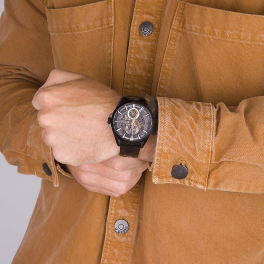 Модель Wainer WA.25511-D сочетает элегантность, швейцарское качество и техническое совершенство. Корпус диаметром 46 мм выполнен из нержавеющей стали 316L с PVD-покрытиемPVDУльтратонкое покрытие наносится в технике вакуумного напыления, сочетает в себе нитрид титана особой прочности со слоем золота или оксида хрома. Несёт в себе декоративную или защитную функцию., обеспечивая прочность и долговечность. Скелетонизированный циферблат раскрывает сложность автоматического механизма Landeron Depa DP2072, а сапфировое стеклоСапфировое стеклоПрочный и надёжный материал из кристалла сапфира синтетического происхождения, характеризующийся особой твёрдостью и устойчивостью к царапинам и повреждениям. защищает дисплей от царапин и механических повреждений. Прозрачная задняя крышка подчеркивает эстетику работы механизма, а браслет из нержавеющей стали 316L с PVD-покрытиемPVDУльтратонкое покрытие наносится в технике вакуумного напыления, сочетает в себе нитрид титана особой прочности со слоем золота или оксида хрома. Несёт в себе декоративную или защитную функцию. и на застёжке-бабочке с кнопкамиЗастёжка "бабочка"Такой вид застёжки дополняется предохранителями, помогающими избежать случайного раскрытия браслета. Обладают изящным исполнением. гарантирует надежную фиксацию и комфортное ношение. Водонепроницаемость до 50 метров защищает часы от случайных брызг и дождя. Wainer WA.25511-D — это стильный аксессуар для мужчин, ценящих швейцарское качество, современный дизайн и мастерство часового искусства.