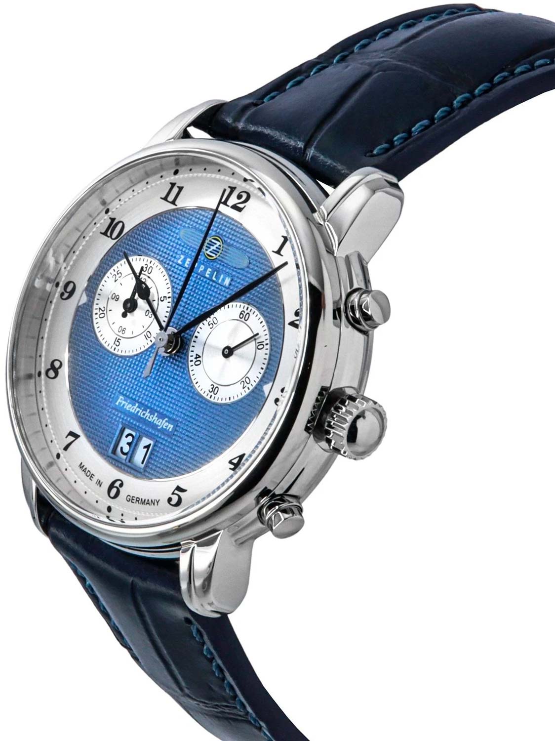 Мужские наручные кварцевые часы-хронограф Zeppelin ZEP-85843 из коллекции Friedrichshafen Chronograph выполнены в классическом стиле и сочетают элегантность с функциональностью. Корпус круглой формы изготовлен из полированной нержавеющей стали и дополнен фирменными кольцами по краю — узнаваемым элементом бренда Zeppelin. Механизм — кварцевый, калибр Ronda 5020.B , оснащённый 5 камнями, обеспечивающий точность и надёжность хода. Часы имеют функцию хронографаХронографФункция позволяет измерять отрезки времени с особой точностью: часы, минуты, секунды. Верным признаком хронографа является наличие на циферблате 3 дополнительных окошек-счётчиков. с секундомеромСекундомерСекундоме́р — прибор, способный измерять интервалы времени с точностью до долей секунды., что делает их удобным аксессуаром для решения различных задач. Циферблат выполнен по технологии гильоше с узором Clous de Paris , придающим ему благородства. Цвет циферблата — голубой гильоше с серебристыми элементами. Метки представлены арабскими цифрами, окошко большой даты расположено в положении 6 часов. Часы оснащены слегка выпуклым минеральным стеклом повышенной прочности K1 минеральное стеклоМинеральное стеклоМинеральное стекло представляет собой искусственно выращенный минерал кварца. Такое стекло отличается особой устойчивостью к повреждениям и царапинам. Уступает по некоторым качествам сапфировому стеклу., устойчивым к мелким повреждениям. Задняя крышка изготовлена из штампованной нержавеющей стали, заводная головка — рифлёная, из нержавеющей стали. Ремешок — из синей натуральной кожи с текстурой, имитирующей крокодилову кожу, дополнен классической застёжкой из нержавеющей стали. Водозащита — 50WR , что позволяет использовать часы в повседневных условиях без риска повреждения от случайных брызг воды. Габаритные размеры: диаметр 40 мм, толщина 11 мм, вес — 82 грамма. Это стильный и практичный аксессуар для тех, кто ценит качество, детали и традиционный подход к дизайну.